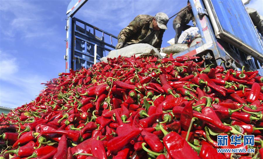 9月19日,在吉林省白城市通榆縣,農(nóng)民在分揀收獲的辣椒。 新華社記者 張楠 攝