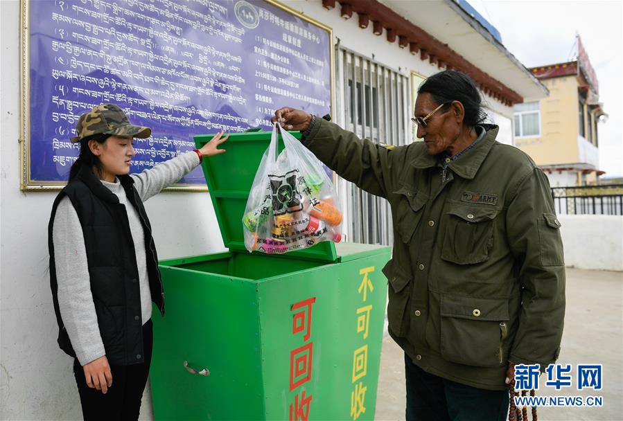 西藏阿里地區(qū)普蘭縣巴嘎鄉(xiāng)居民(右)在“垃圾銀行”兌換點工作人員指引下,將垃圾丟入分類箱中(9月13日攝)。 生活垃圾1袋可兌換胸牌1個,2袋可兌換鑰匙扣1個,可回收垃圾1袋可兌換抽紙1包或濕巾1袋……近日,記者在西藏阿里地區(qū)普蘭縣巴嘎鄉(xiāng)神山圣湖景區(qū)看到,一些游客領(lǐng)取環(huán)保袋在景區(qū)內(nèi)撿垃圾后,拿去兌換西藏特色紀念品。 這一切,得益于當?shù)亻_設(shè)的“垃圾銀行”。今年6月,巴嘎鄉(xiāng)在神山圣湖景區(qū)開設(shè)“垃圾銀行”,鼓勵游客和群眾拾撿垃圾兌換獎品,破解景區(qū)垃圾收運難題,取得良好效果。 新華社記者劉東君攝