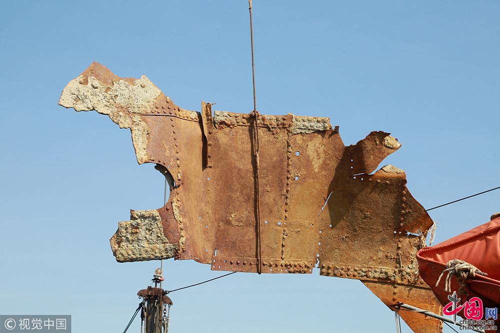 2018年9月25日,遼寧大連,考古工作人員把一片“經(jīng)遠艦”裝甲進行吊裝轉(zhuǎn)運。視覺中國