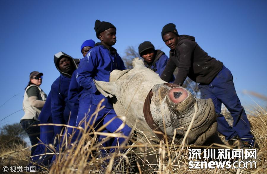 當(dāng)?shù)貢r間2017年8月14日,南非西北省,一名工作人員在為一頭犀牛鋸角,這是一種保護(hù)犀牛的行為,可以防止它們喪命于偷獵者的槍口下。