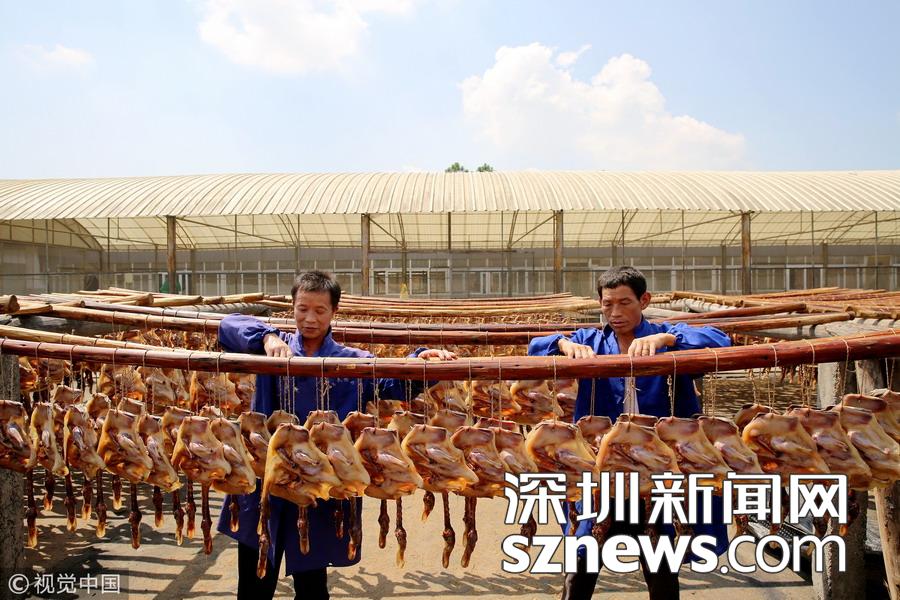 2018年9月19日,江西吉安,吉水縣八都鎮(zhèn)板鴨廠的員工正在晾曬板鴨。