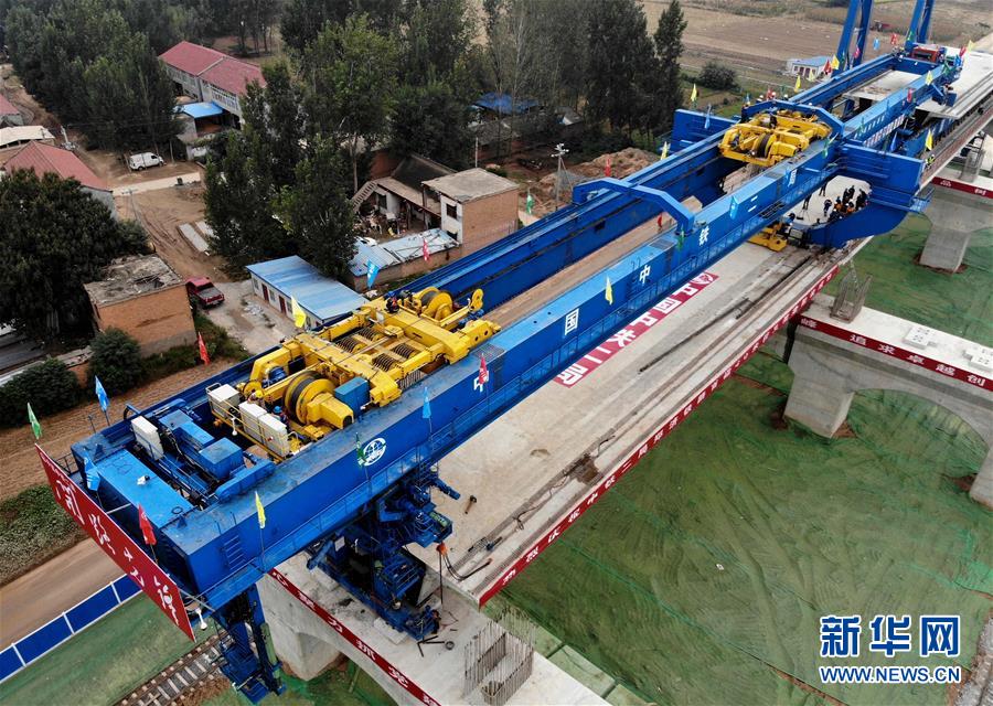 9月27日,中鐵二局的施工人員使用大型機械在鄭(州)濟(南)高速鐵路(鄭濮段)站前工程VI標(biāo)施工現(xiàn)場架設(shè)40米簡支箱梁(無人機拍攝)。 新華社記者李安攝