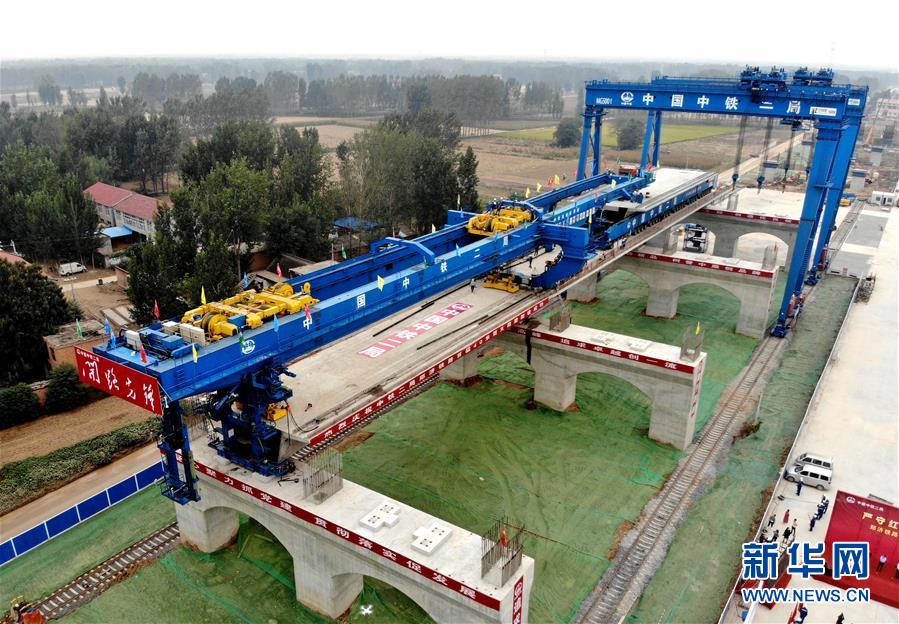 9月27日,中鐵二局的施工人員使用大型機(jī)械在鄭(州)濟(jì)(南)高速鐵路(鄭濮段)站前工程VI標(biāo)施工現(xiàn)場(chǎng)架設(shè)40米簡支箱梁(無人機(jī)拍攝)。 新華社記者李安攝