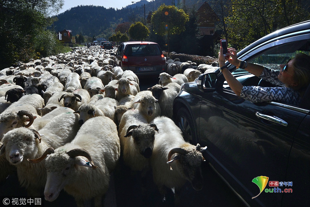 2018年9月27日訊(具體拍攝時(shí)間不詳),波蘭,浩浩蕩蕩的綿羊大軍為了趕在冬天之前回到農(nóng)場(chǎng)過冬,阻斷了鄉(xiāng)村的主車道。