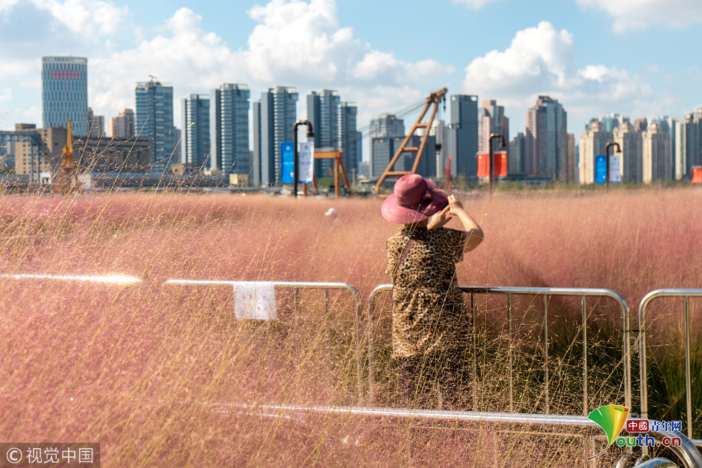 2018年9月28日,上海,東外灘楊浦濱江的粉黛亂子草目前已進入盛花期,當日早間,不少市民來到濱江拍照賞景,成片的紫色花海在藍天白云映襯下美不勝收。圖片作者:王岡/視覺中國
