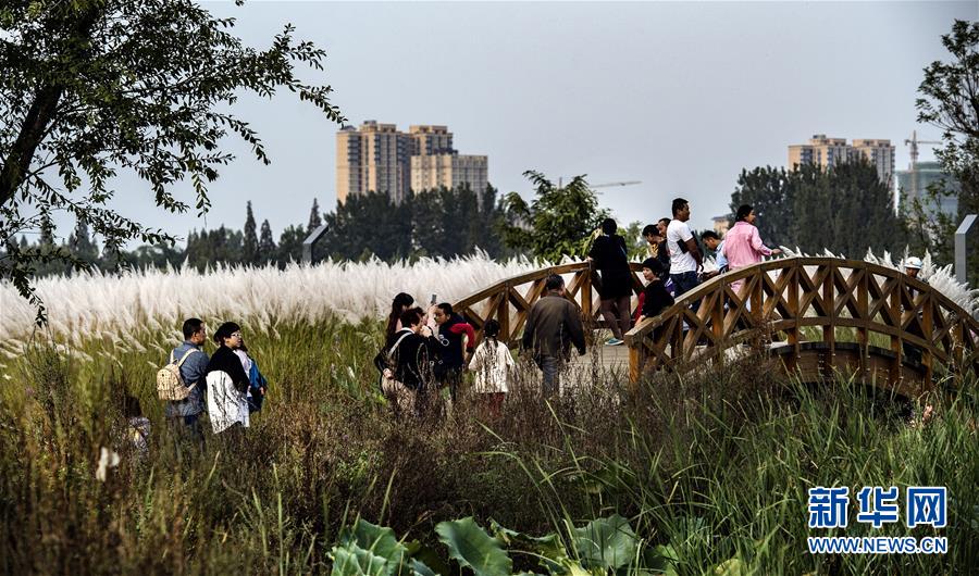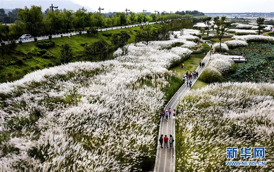 9月28日,人們?cè)谔J花盛開的漢江濕地公園里游覽。新華社記者陶明 攝