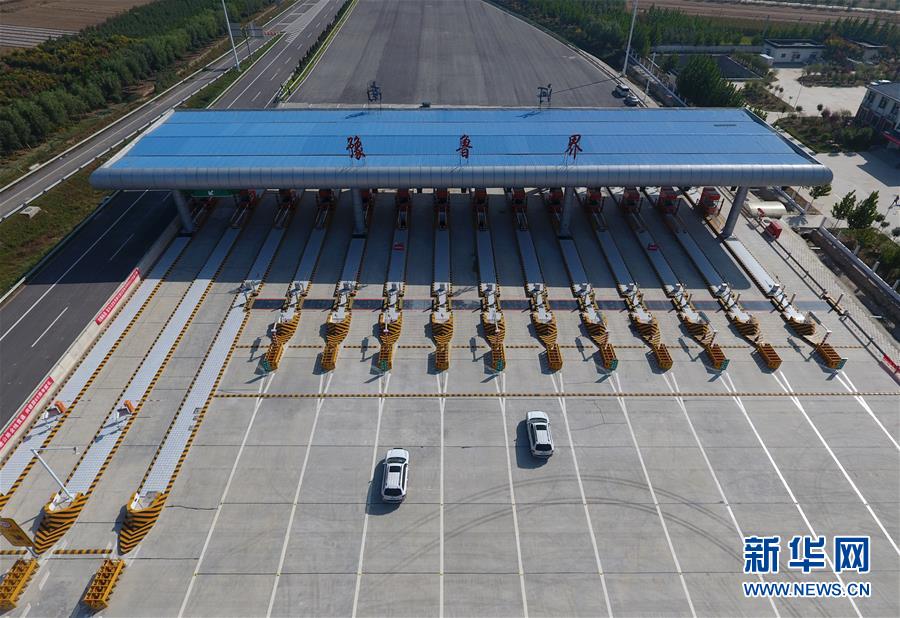 9月28日,車輛準(zhǔn)備通過(guò)河南省南樂(lè)縣的南(樂(lè))林(州)高速豫魯界收費(fèi)站(無(wú)人機(jī)拍攝)。新華社記者 馮大鵬 攝