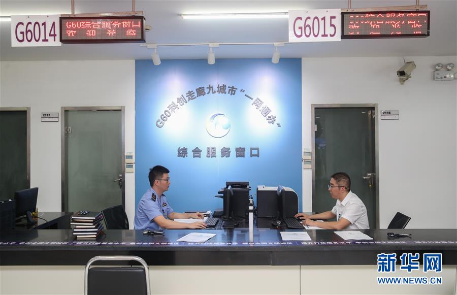 這是上海市松江區(qū)行政服務中心內(nèi)的G60科創(chuàng)走廊九城市“一網(wǎng)通辦”綜合服務窗口(9月28日攝)。新華社記者 丁汀 攝