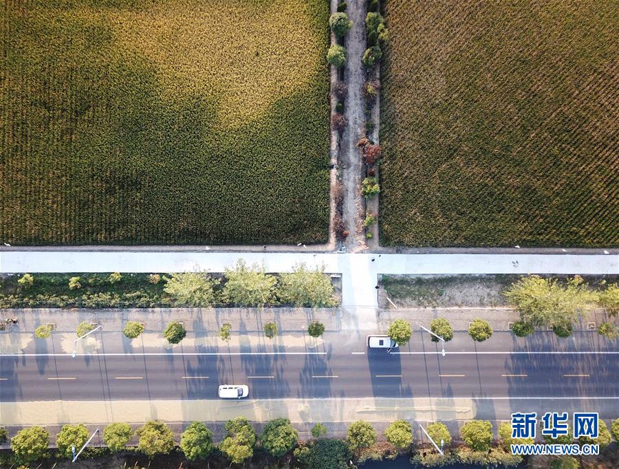 這是小崗村的稻田及公路(9月26日無人機(jī)拍攝)。