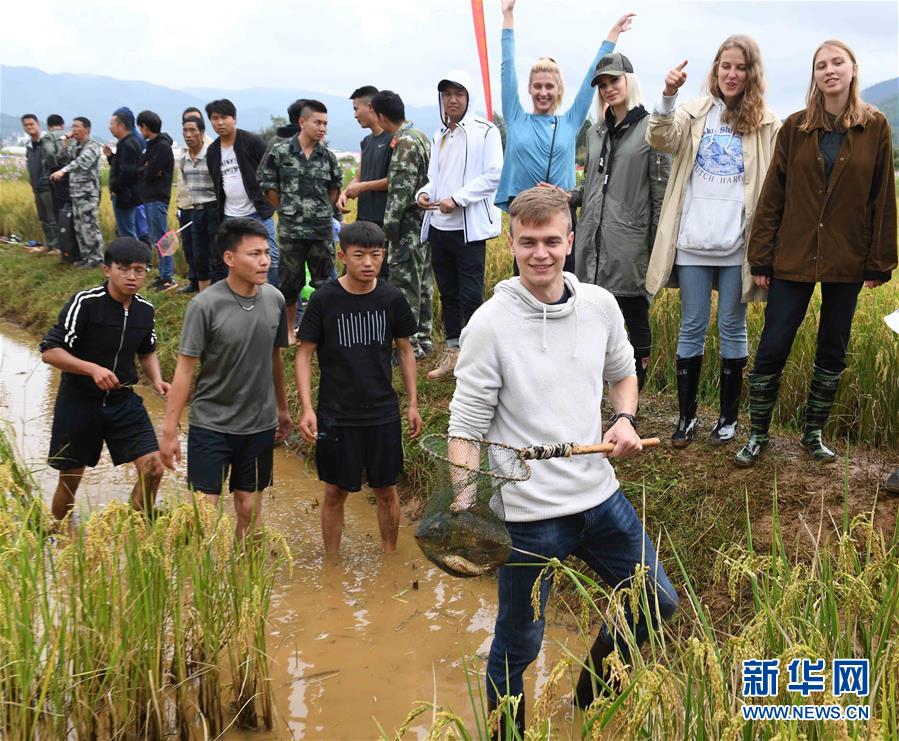 9月29日,外國(guó)游客體驗(yàn)摸魚。9月29日,云南省尋甸回族彝族自治縣2018年首屆農(nóng)民豐收節(jié)暨第二屆摸魚節(jié)在雞街鎮(zhèn)舉行,當(dāng)?shù)剞r(nóng)民和游客在豐收的稻田里進(jìn)行摸魚、拔谷穗、山歌對(duì)唱等活動(dòng),享受收獲的喜悅。新華社記者楊宗友攝