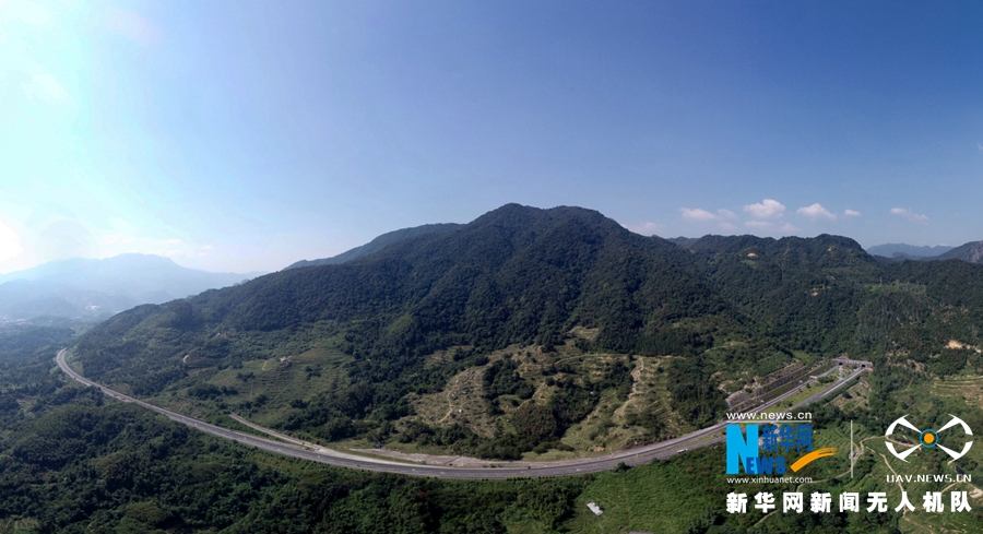 拼接照片:這是廈蓉高速南靖縣建安隧道(右)外的長(zhǎng)下坡路段。改擴(kuò)建工程竣工之后,長(zhǎng)下坡將改成上行線,變?yōu)樯掀侣范危o(wú)人機(jī)拍攝)。新華網(wǎng) 肖和勇 攝