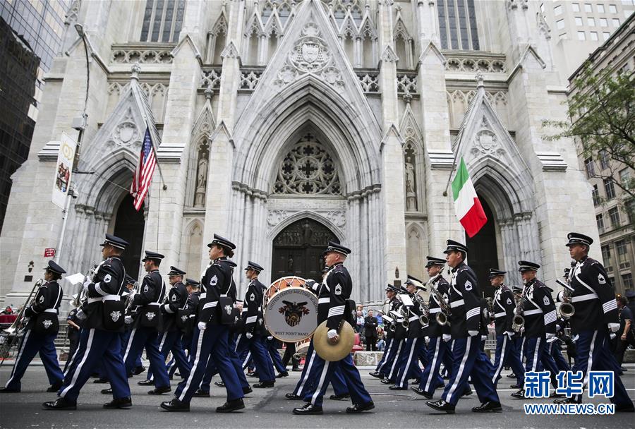 10月8日,在美國紐約曼哈頓第五大道,美國西點(diǎn)軍校樂隊(duì)參加哥倫布日游行。 新華社記者王迎攝