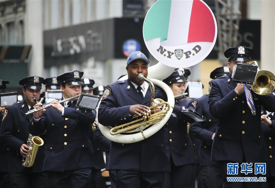10月8日,在美國紐約曼哈頓第五大道,紐約警察樂隊(duì)參加哥倫布日游行。 新華社記者王迎攝