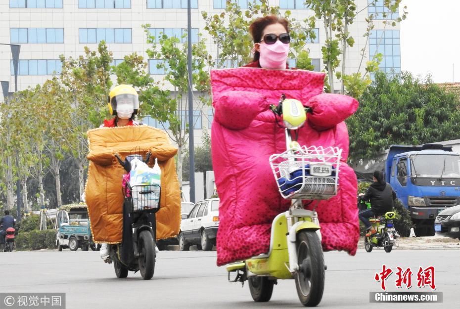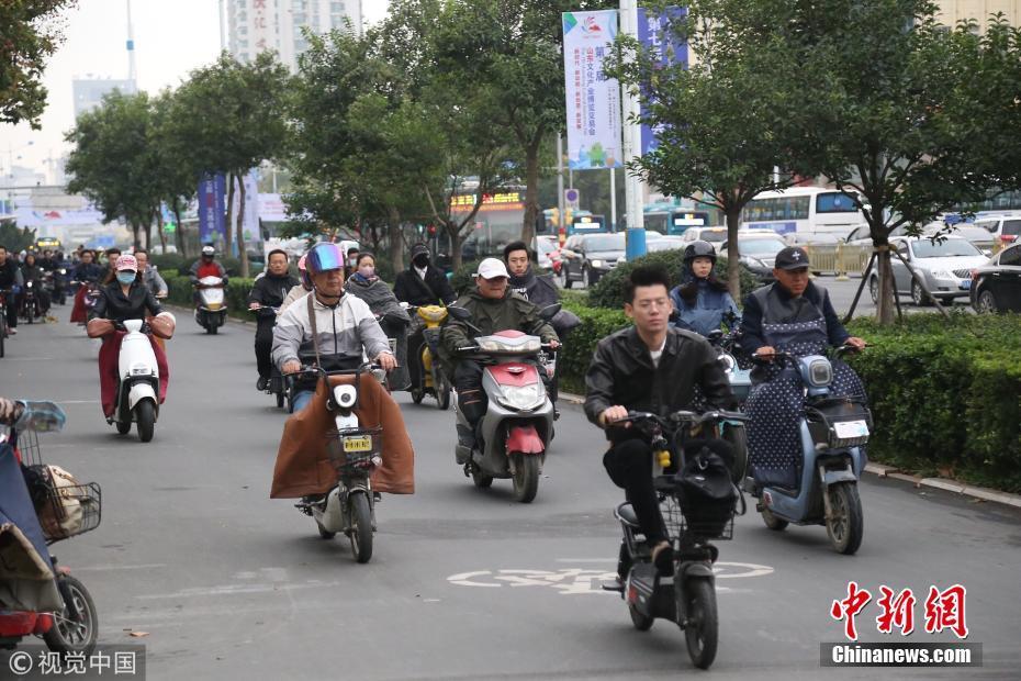 2018年10月9日,山東濟(jì)南,昨日一場(chǎng)秋雨過(guò)后開始降溫,今天清晨最低氣溫只有6度,馬路上不少上班族穿上羽絨服騎車趕上班路。 圖片來(lái)源:視覺中國(guó)