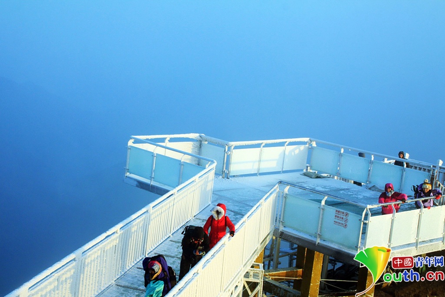 上到金子山最高峰可以看到,玻璃天梯像一條巨龍,沿著金子山最高峰山腰蜿蜒而上,每一個(gè)階梯都是玻璃做的,頂上是藍(lán)天白云,四周是莽莽群山,天梯下面是深不可測(cè)的懸崖絕壁?!?/p>