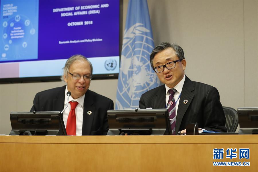 10月8日,在位于紐約的聯合國總部,聯合國負責經濟和社會事務的副秘書長劉振民(右)向記者介紹《2018年世界經濟和社會概覽》。 新華社記者李木子攝