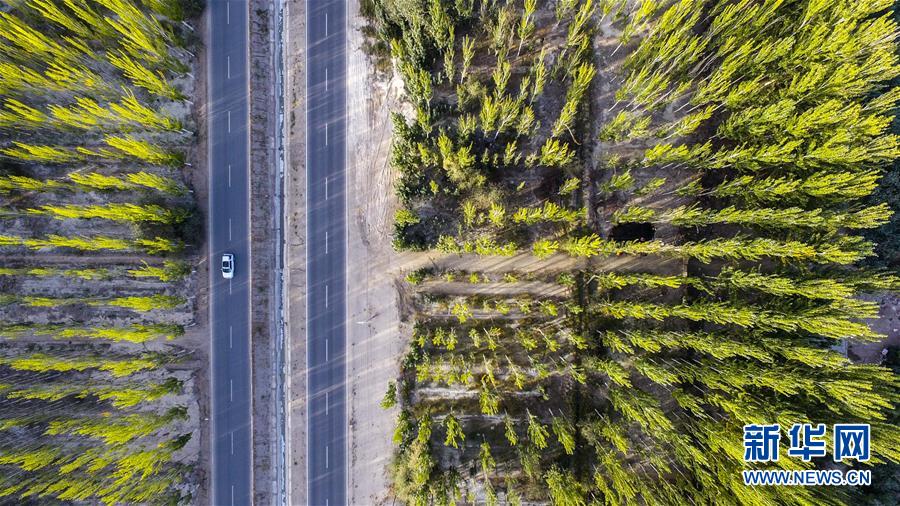 車輛行駛在新疆阿克蘇地區(qū)柯柯牙綠化工程核心區(qū)(9月20日無(wú)人機(jī)拍攝)。 在世界第二大流動(dòng)性沙漠——塔克拉瑪干沙漠西北邊,一條逾百萬(wàn)畝的人工林帶傲然挺立。 這條林帶就是柯柯牙荒漠綠化工程。它是新疆阿克蘇黃沙漫漫和碧波萬(wàn)頃的分界嶺。 1986年,為改變惡劣的自然條件,阿克蘇啟動(dòng)柯柯牙綠化工程。30年間,各族干部群眾攜手奮斗,曾是沙塵暴策源地的柯柯牙綠樹成蔭;并以此為原點(diǎn),在南疆戈壁荒灘上孕育出百萬(wàn)畝的“綠?!薄?30多年來(lái),阿克蘇打造出“人走政不息”的樣本,使綠色發(fā)展理念成為幾代人的廣泛共識(shí);“自力更生、艱苦奮斗、無(wú)私奉獻(xiàn)”的柯柯牙精神,已融入各族兒女血液中;“以林養(yǎng)林”“邊綠化邊脫貧”的綠化、脫貧方式,給其他荒漠地區(qū)貢獻(xiàn)了“柯柯牙智慧”。 新華社記者 胡虎虎 攝