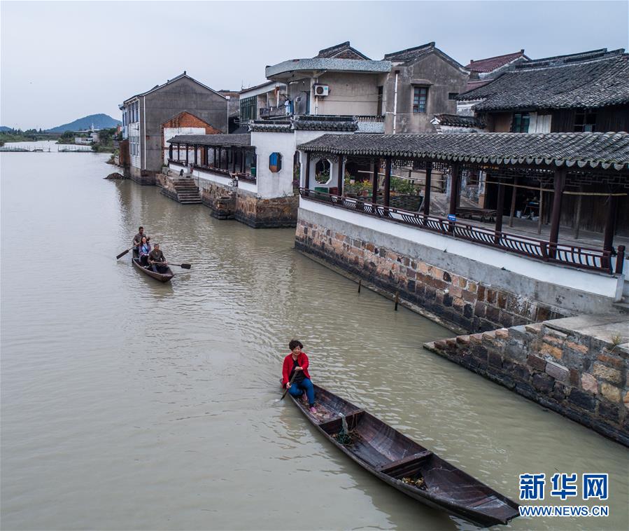 10月10日,泉家潭村村民劃著小船經(jīng)過沿河長廊(無人機拍攝)。經(jīng)過改造提升后,沿河長廊和整潔的古村街巷成為當?shù)孛利愢l(xiāng)村的景觀帶。 新華社記者 徐昱