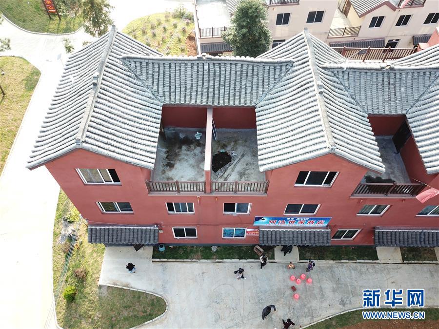 白褲瑤族同胞在廣西南丹縣里湖瑤族鄉(xiāng)移民集中安置點(diǎn)的新居前(10月11日無人機(jī)航拍)。新華社記者 周華 攝
