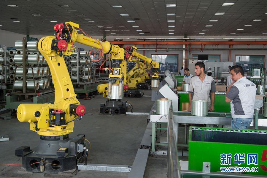 2018年8月28日,在埃及蘇伊士運河之畔的泰達工業(yè)園區(qū),埃及工人在中國巨石埃及玻璃纖維股份有限公司(巨石埃及)生產(chǎn)車間內(nèi)工作。