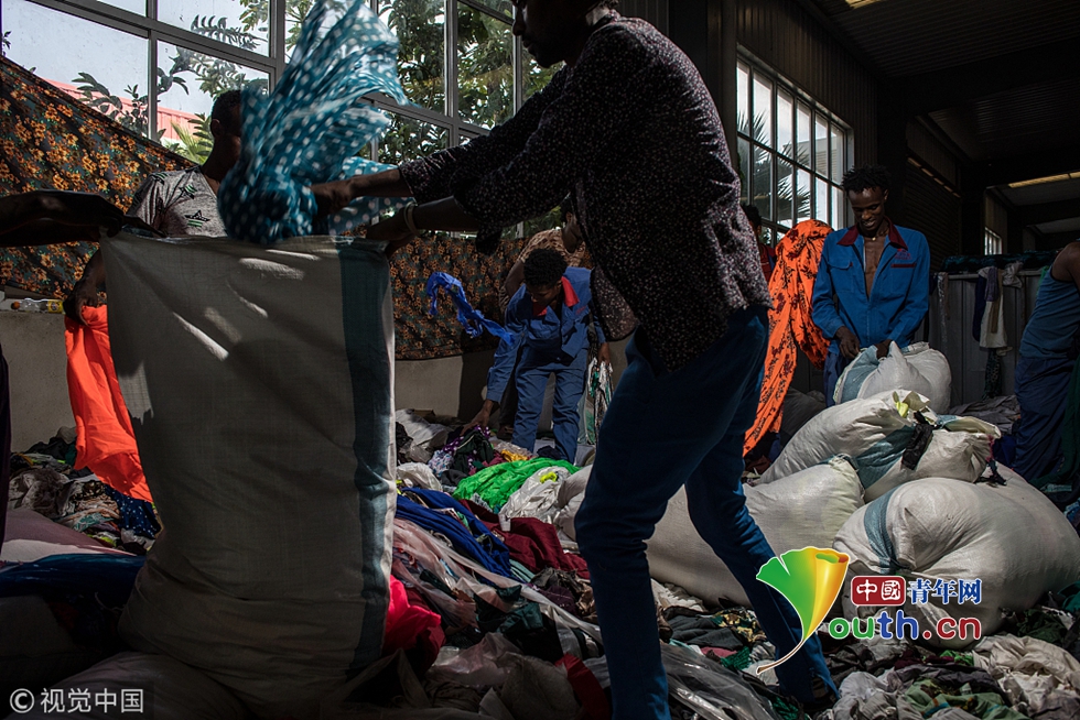 東方工業(yè)園的中國(guó)紡織印染廠,當(dāng)?shù)毓蛦T在整理廢棄的布頭。