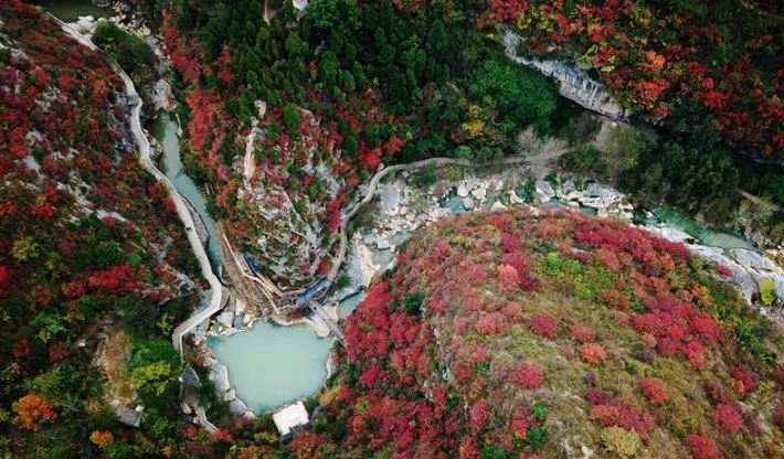 2018年10月14日,陜西漢中,西成高鐵漢中市寧強(qiáng)縣高寨子路段上的一列動車正從紅艷艷的蘆葦花海附近駛過。