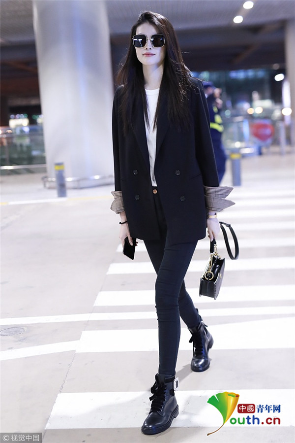 2018年10月15日,上海,何穗亮相機(jī)場(chǎng)。她身穿深色西裝搭配黑色緊身褲大秀超模身材,簡(jiǎn)約造型依舊高級(jí)感十足,輕撩秀發(fā)散發(fā)女人味。