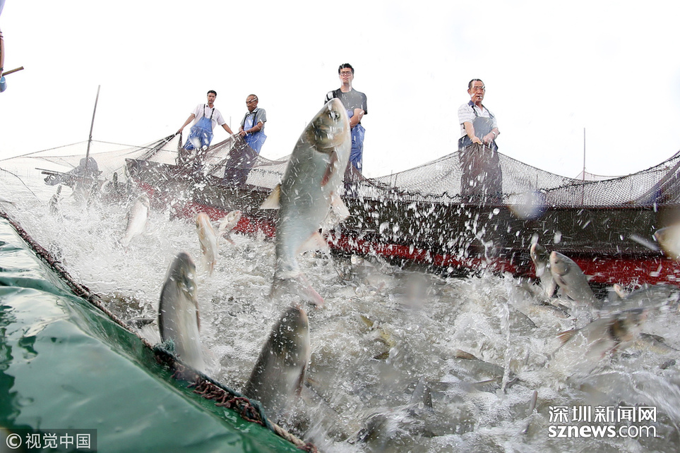2018年6月26日,江蘇省常州市嘉澤鎮(zhèn)捕撈村的漁民組織夏季捕撈,一網(wǎng)魚達五萬余斤,以鰱魚為主,供應市場需求。夏捕的魚價較平時有所上漲,漁民粗略估計可增收上萬余元。