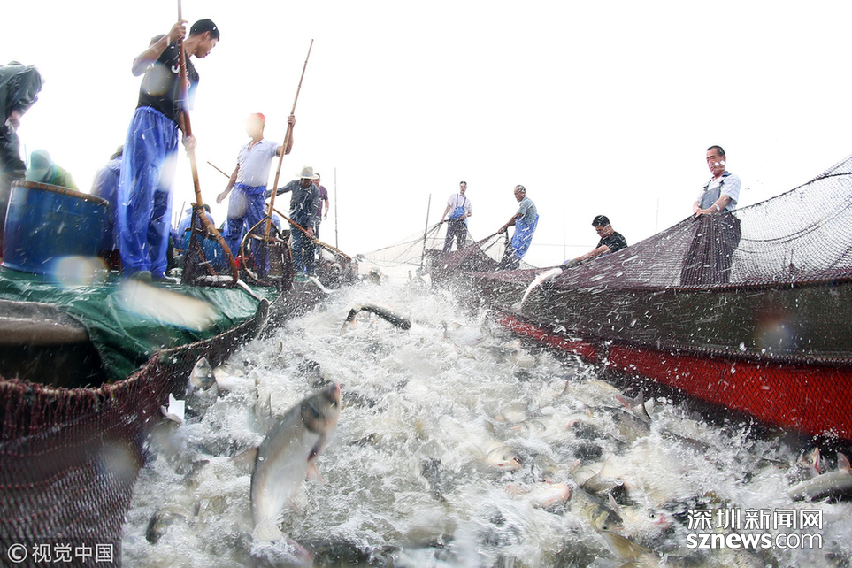 2018年6月26日,江蘇省常州市嘉澤鎮(zhèn)捕撈村的漁民組織夏季捕撈,一網(wǎng)魚達五萬余斤,以鰱魚為主,供應市場需求。夏捕的魚價較平時有所上漲,漁民粗略估計可增收上萬余元。