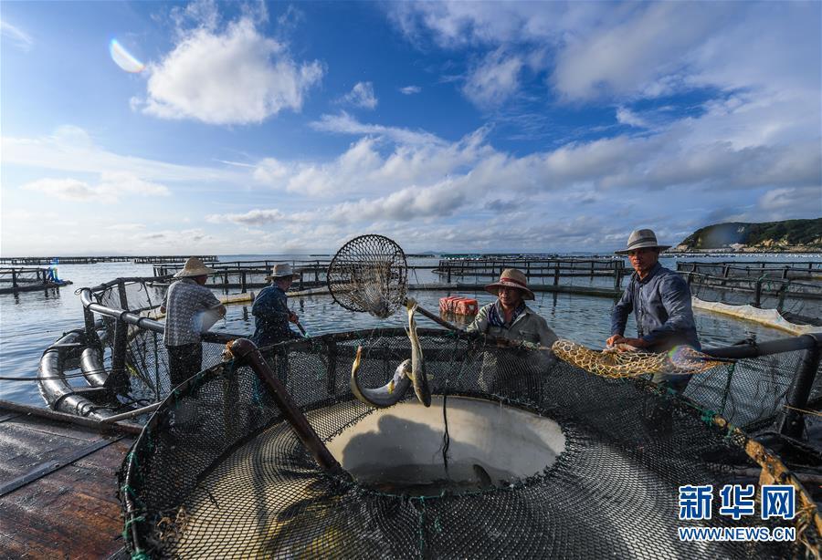 8月18日,南麂島海域內的“海上牧場”養(yǎng)殖區(qū)內,漁民正捕撈大黃魚,處于仿生養(yǎng)殖環(huán)境的大黃魚需要生長2至3年。進入8月,浙江省溫州市平陽縣南麂鎮(zhèn)海域上大片的大黃魚、貽貝等特色海產(chǎn)品養(yǎng)殖區(qū)域迎來豐收季節(jié),養(yǎng)殖戶們駕駛漁船在養(yǎng)殖區(qū)海域進行打撈收獲,在碧海藍天下構成了一幅“海上牧場”的美麗豐收景象。近年來,南麂鎮(zhèn)政府引導漁民養(yǎng)殖戶充分發(fā)揮“靠海吃海”的資源優(yōu)勢,大力發(fā)展海洋養(yǎng)殖經(jīng)濟和海島旅游經(jīng)濟,實現(xiàn)了南麂由“生態(tài)美”向“產(chǎn)業(yè)美”,“產(chǎn)業(yè)美”向“經(jīng)濟美”的轉變。同時該鎮(zhèn)堅持以大黃魚、貽貝等為特色產(chǎn)業(yè)支撐,精準發(fā)展高效海洋養(yǎng)殖業(yè),重點培養(yǎng)一批新型職業(yè)漁民,依靠專業(yè)技術支持,實現(xiàn)深海仿生養(yǎng)殖,讓好生態(tài)造就好品質,重點打造南麂養(yǎng)殖品牌,組建營銷網(wǎng)絡,拓展特色海產(chǎn)品市場。新華社記者 徐昱攝
