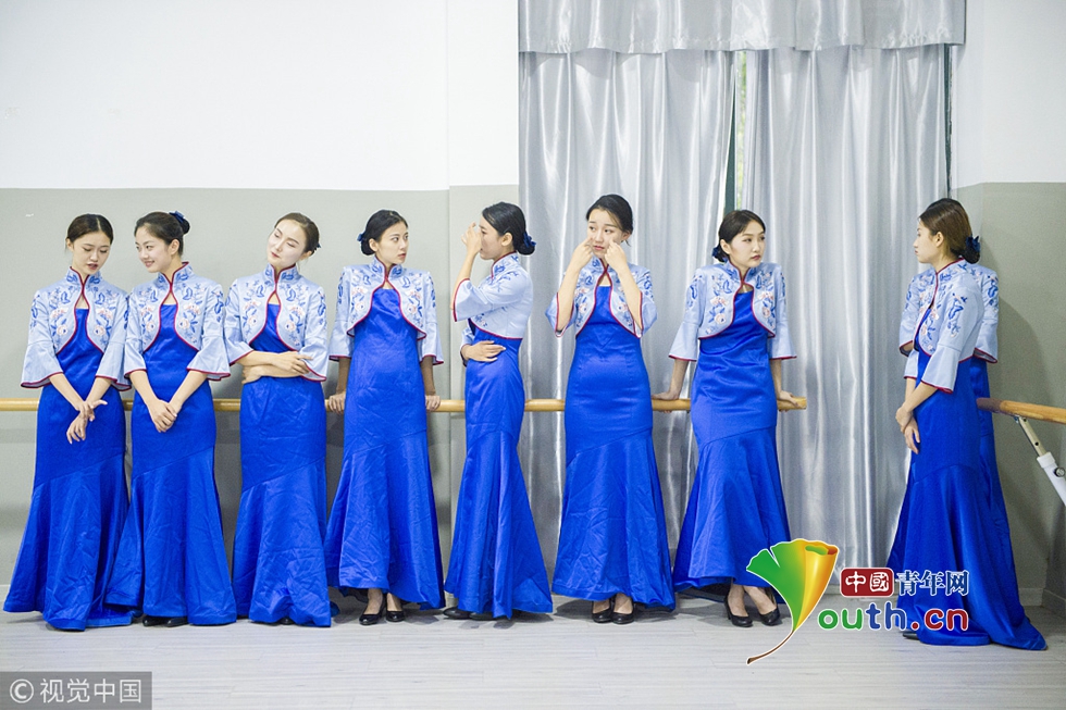 來自浙江傳媒學院的禮儀志愿者們正在進行緊張有序的集中訓練。圖片作者:浙江日報 馮賀/視覺中國