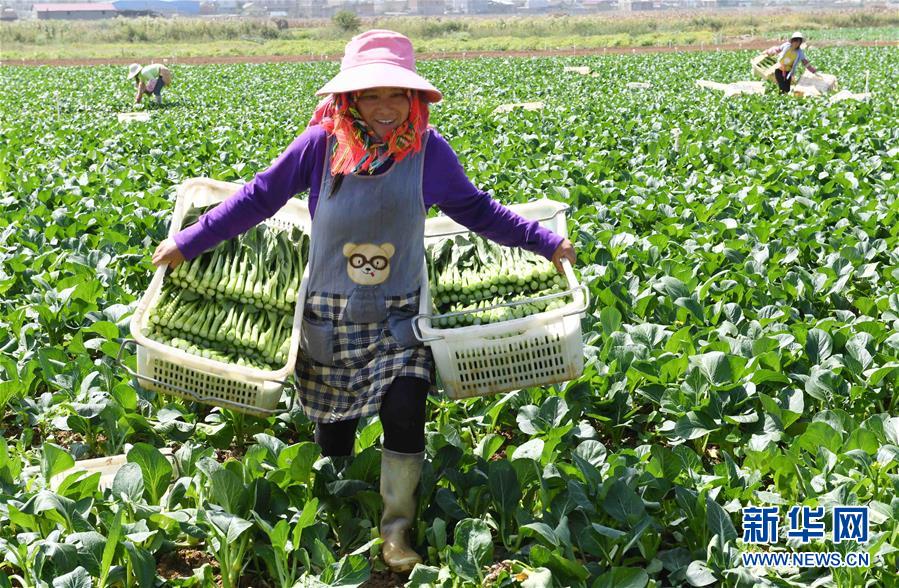 10月16日,硯山縣小補(bǔ)佐村的村民在種植基地收菜。 云南省文山壯族苗族自治州硯山縣稼依鎮(zhèn)小補(bǔ)佐村有55戶(hù)200多名壯族群眾曾經(jīng)居住在大山深處。2017年10月,在政府的幫扶下,小補(bǔ)佐村易地扶貧建設(shè)新村,村民全部搬遷入住新居。 新華社記者 楊宗友 攝