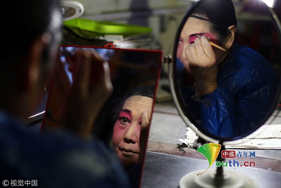2016年3月10日,陜西安康,今年70歲的劉鳳鳴10歲時開始學(xué)漢調(diào)二黃,40歲時從廁所抱回智殘體殘棄嬰,因?yàn)閷λ囆g(shù)的熱愛、對生命的敬畏她選擇了不離不棄。人生如戲,戲如人生。劉鳳鳴說,像她們這樣的業(yè)余劇團(tuán),沒有專門的化妝師,她要求每個演員必須學(xué)會化妝。圖片作者:魏永賢/視覺中國