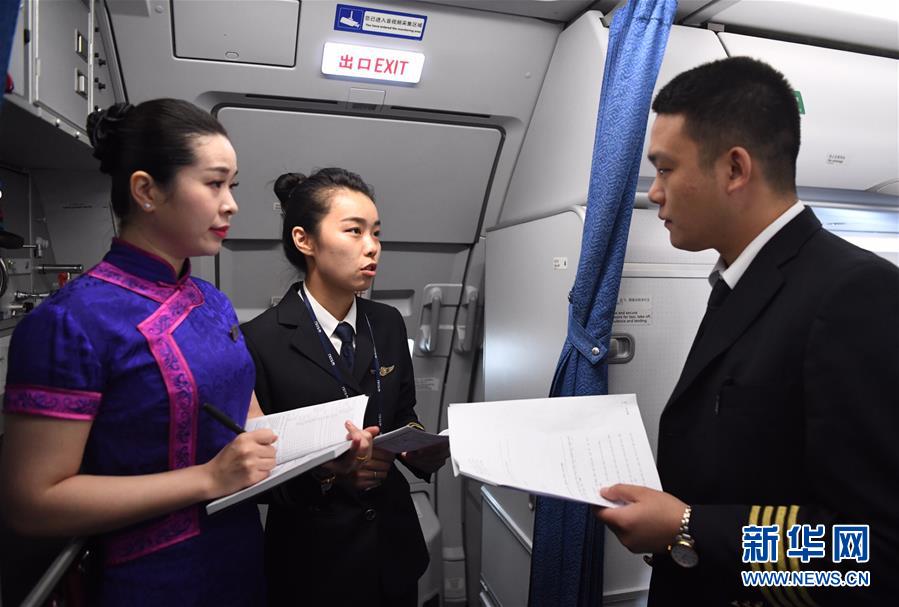 10月16日,湯春燕(中)參加航前機(jī)組協(xié)同準(zhǔn)備會。 新華社記者王全超攝