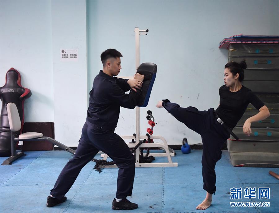 10月16日,湯春燕在健身房內(nèi)進(jìn)行擒敵訓(xùn)練。