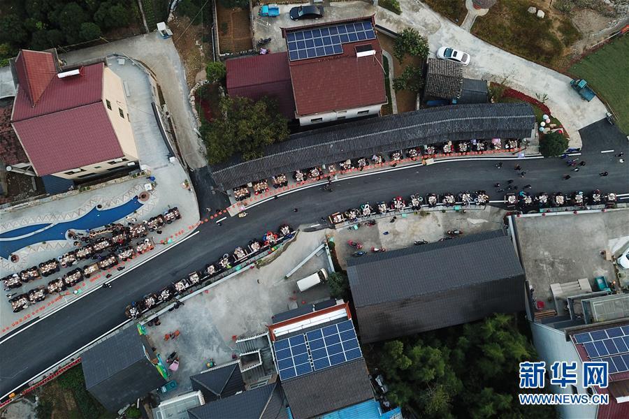10月17日,村民與賓客在龍峰民族村參加“長桌宴”(無人機拍攝)。 當日,在浙江省桐廬縣莪山畬族鄉(xiāng)龍峰民族村,一百桌宴席沿道路擺成一字長蛇陣,四方賓客和當?shù)卮迕褚黄鹌穱L著具有畬族特色的菜肴,場面頗為壯觀。 新華社記者 黃宗治 攝