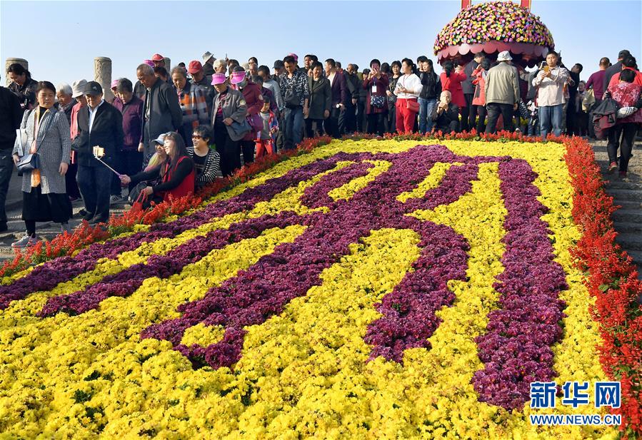 10月17日,游客在開封龍亭公園欣賞菊花。重陽時節(jié),各色菊花競相綻放,把古都開封裝點得分外秀美,吸引眾多游客前來觀賞游玩。 新華社記者 李安 攝