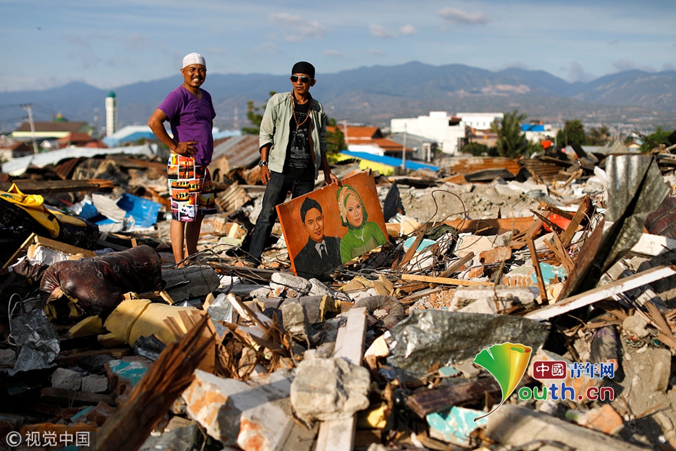 當?shù)貢r間2018年10月7日,印尼帕盧,兩名男子從地震廢墟中找回他們去世父母的畫像。圖片作者:JORGE SILVA/視覺中國