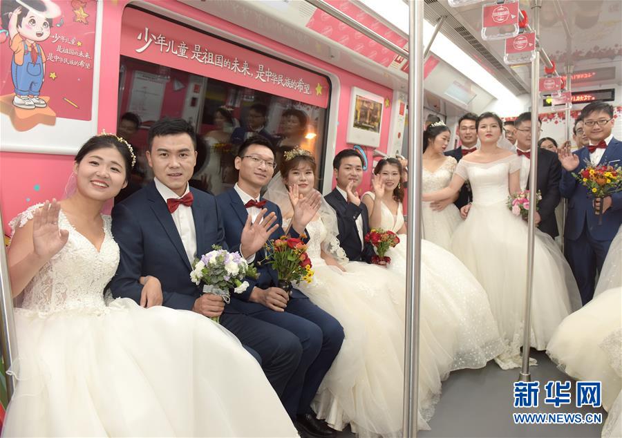10月18日,在合肥市地鐵一號線,新人們準備乘坐地鐵。當(dāng)日,中鐵四局集團城市軌道交通工程分公司的18對新人在安徽合肥地鐵一號線的車廂里舉行了一場集體婚禮儀式。 新華社記者 郭晨 攝