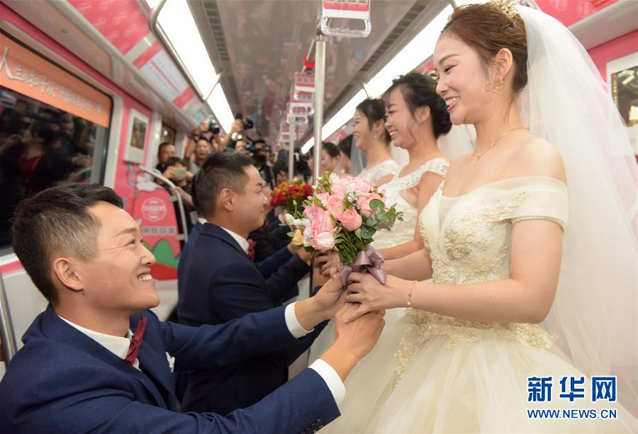 10月18日,在合肥市地鐵一號線車廂內(nèi),新人們互相許諾,期許愛情。 當(dāng)日,中鐵四局集團城市軌道交通工程分公司的18對新人在安徽合肥地鐵一號線的車廂里舉行了一場集體婚禮儀式。 新華社記者 郭晨 攝