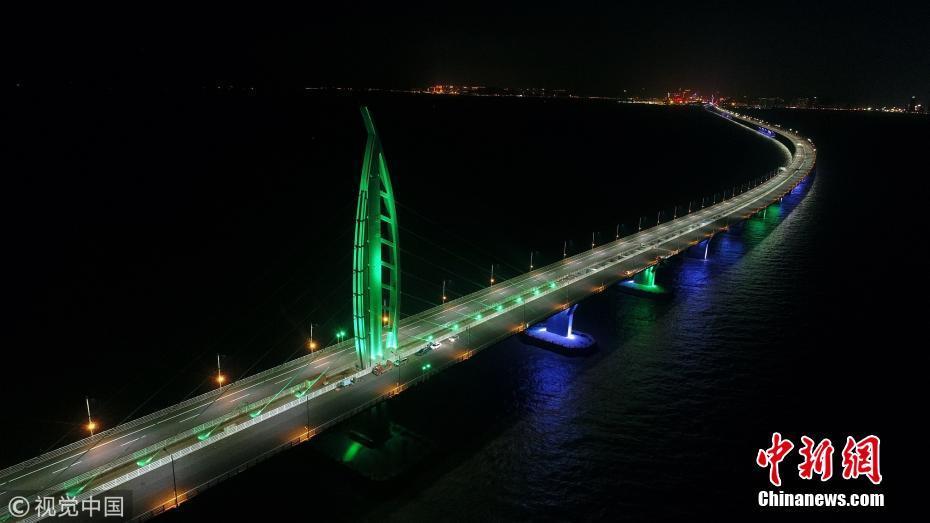 2017年12月30日,珠海,港珠澳大橋九洲航道橋、江海直達(dá)船航道橋燈火璀璨,在五顏六色的裝飾燈映襯下,整座大橋熠熠生輝。王榮 攝 圖片來(lái)源:視覺(jué)中國(guó)