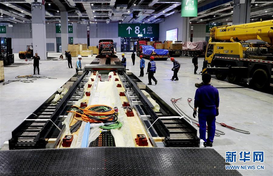 10月22日,“金牛座”龍門銑床床身(前)等待裝運。 當日,來自德國的首屆進口博覽會最大展品——“金牛座”龍門銑床完成初步組裝,將運往國家會展中心(上海)3號館進行最后的安裝施工。這是德國瓦德里??票す狙邪l(fā)的機床設備,高約8米,占地面積約200平方米,將在智能及高端裝備區(qū)進行展出。 新華社記者方喆攝