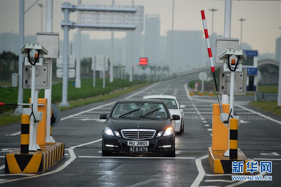 10月24日,首輛私家車行駛在澳門口岸入境車道上。當日,港珠澳大橋正式通車。 新華社記者張金加攝