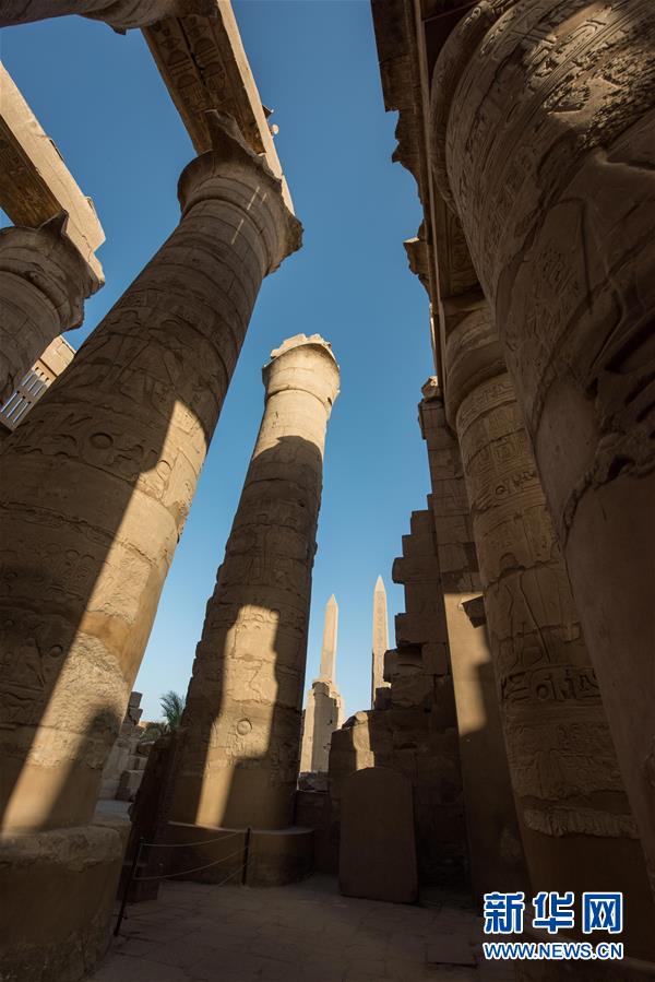 這是10月23日在埃及盧克索拍攝的卡納克神廟內的石柱與方尖碑。
