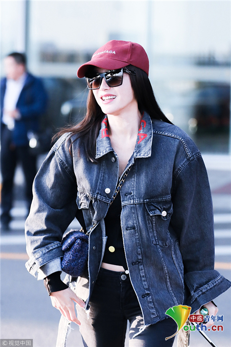 2018年10月24日,北京,“富察皇后”秦嵐現(xiàn)身機(jī)場。她頭戴小紅帽,身穿黑色緊身褲顯美腿筆直修長,上身穿著牛仔外套青春逼人,邊走邊甜笑玩“撩發(fā)殺”,靚麗吸睛。