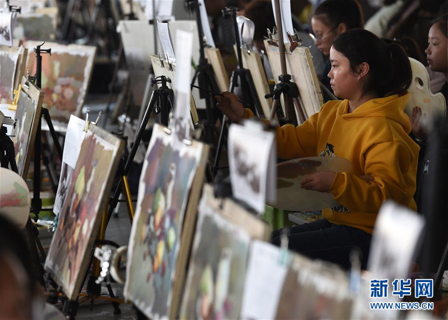 10月24日,考生在南京青藍(lán)畫室教學(xué)基地考點(diǎn)參加色彩科目模擬考試。