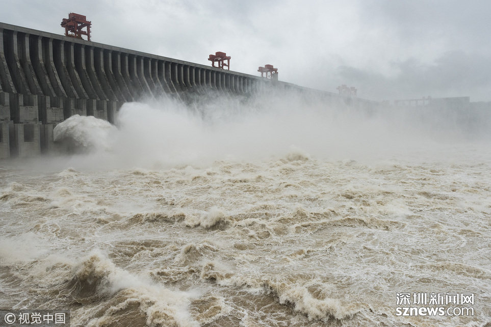 2018年7月5日,湖北宜昌,江水通過三峽大壩泄洪深孔下泄。