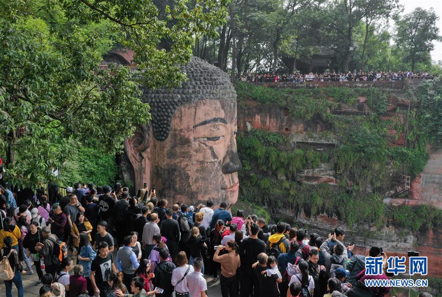 10月4日,游客在樂(lè)山大佛前排隊(duì)一睹大佛真容(無(wú)人機(jī)拍攝)。 新華社記者 江宏景 攝