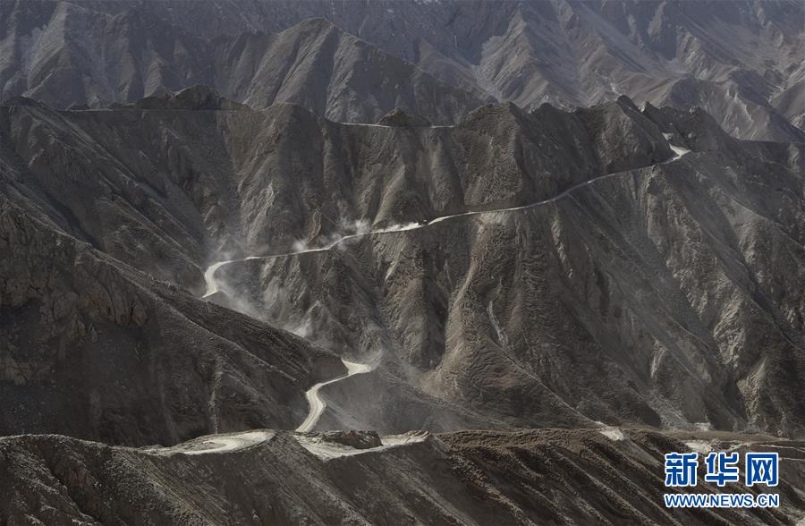 在距離且末縣縣城160多公里的昆侖山上的興發(fā)達(dá)玉礦,可見對面山上運載銅鋅礦礦石的卡車行駛在簡易礦山公路上(10月23日攝)。 新華社記者武巍攝