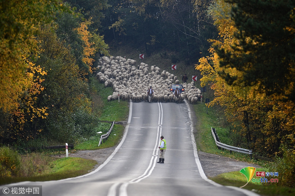 車(chē)輛不得不停下來(lái),仿佛被無(wú)窮無(wú)盡的羊群吞沒(méi)了,場(chǎng)面非常壯觀。